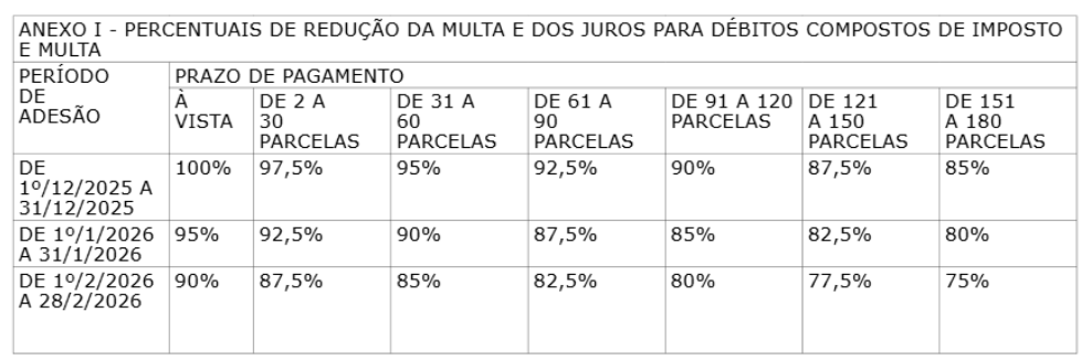 Condições: Até 180 parcelas e descontos que chegam a 100% nas multas e juros para quem pagar à vista em dezembro/2025.