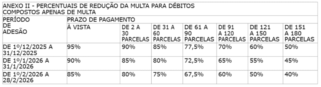 PERCENTUAIS DE REDUÇÃO DA MULTA PARA DÉBITOS COMPOSTOS APENAS DE MULTA